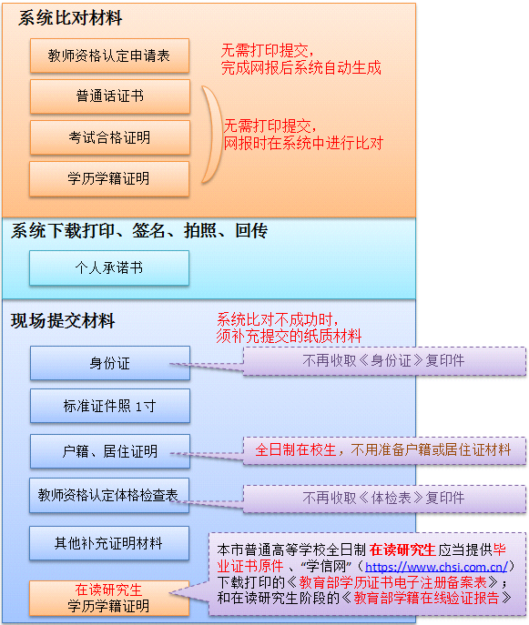 北京教師資格證認定材料提交分為系統(tǒng)比對和現(xiàn)場提交兩部分。部分材料在網(wǎng)報時直接通過系統(tǒng)進行比對,比對成功的無需現(xiàn)場提供;比對不成功的,須按公告要求,提供補充材料。