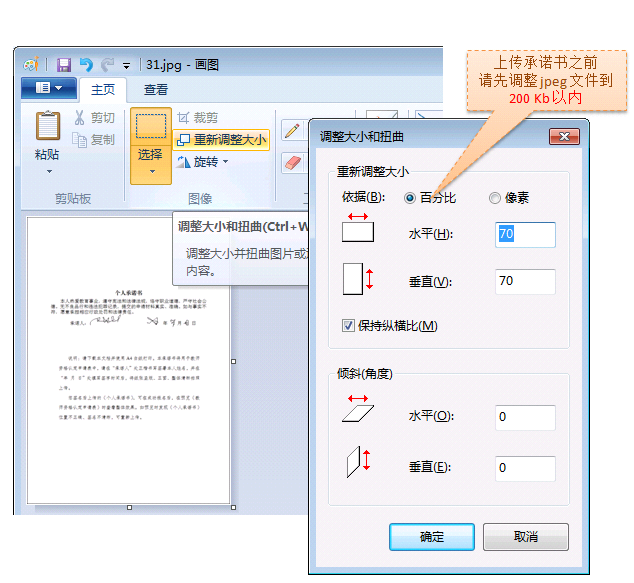 上傳個人承諾書要求以圖片形式,且不大于200kb。個人承諾書處理步驟: