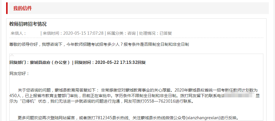 更多問(wèn)題歡迎再次登陸網(wǎng)站留言,或者撥打7812345縣長(zhǎng)熱線、關(guān)注蒙城縣長(zhǎng)熱線微信公眾號(hào)(xianzhangrexian)進(jìn)行反映。