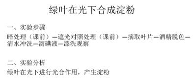 接下來就是實驗步驟部分的講解,本實驗對于學生理解綠色植物的光合作用有著非常重要的意義:它既是學生接觸的第一個比較復雜的植物生理學實驗,又是揭示光合作用本質(zhì)的第一個實驗。所以,在進行實驗教學時,我組織學生做好實驗前期的準備工作,課上重點做"檢驗綠葉在光下制造淀粉"的實驗。在課上我會用大屏幕展示實驗前的預處理的圖片和資料:實驗前2-3天黑暗處理的天竺葵,實驗前2-3小時進行遮光對照處理。接著提出問題:實驗前為什么要進行黑暗處理?葉片部分遮光的目的?哪個是對照組,哪個是實驗組?單一變量是什么?學生思考后能夠給出答案:黑暗處理讓葉片中原有的淀粉轉(zhuǎn)運消耗掉,對葉片進行遮光處理是設(shè)置的對照。綜合以上分析引導學生結(jié)合教材整理并正確安排實驗步驟。提醒學生注意安全和訓練規(guī)范的操作技能。組織學生進行驗證綠葉在光下制造淀粉的實驗。在我的組織下學生會按照實驗步驟:暗處理(課前)—遮光對照處理(課前)—摘取葉片—酒精脫色—清水沖洗—滴碘液—漂洗觀察,進行分組實驗。實驗結(jié)束后請學生匯報實驗結(jié)果和分析實驗結(jié)果。學生通過觀察實驗結(jié)果能夠知道用碘液染色后,葉片不遮光的部分變成藍色,葉片遮光部分不變藍。說明光是植物光合作用合成淀粉的必需條件。從而認同光合作用必須在光下進行;光合作用能夠產(chǎn)生有機物。