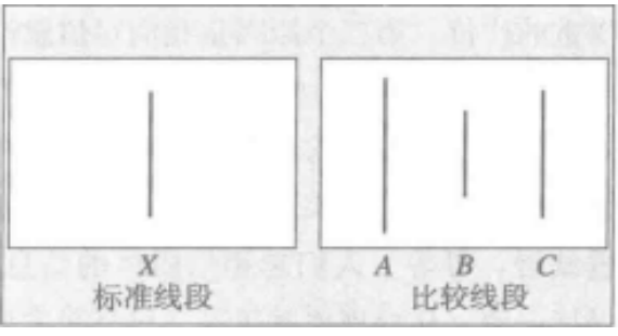 讓一位真被試與另外7~9人(實(shí)際上是實(shí)驗(yàn)者的助手)一起坐在桌旁,實(shí)驗(yàn)者向他們呈現(xiàn)三條長(zhǎng)短不一的線段,并要求他們判斷哪一條和另一幅畫(huà)中的標(biāo)準(zhǔn)線段一樣長(zhǎng)。每個(gè)人輪流大聲說(shuō)出自己的判斷,而被試在倒數(shù)第二的位置上。在大多數(shù)測(cè)試中,每人都說(shuō)出同樣的正確回答。但在幾次預(yù)先確定的關(guān)鍵測(cè)試中,實(shí)驗(yàn)者預(yù)先告訴助手說(shuō)出錯(cuò)誤的答案。結(jié)果發(fā)現(xiàn),即使正確答案十分明顯,但在關(guān)鍵測(cè)試中,被試迎合團(tuán)體的意見(jiàn)平均達(dá)32%,有74%的被試至少有1次從眾。