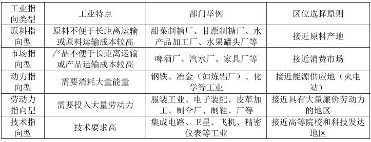 影響工業(yè)發(fā)展的區(qū)位因素有很多,但總有一個(gè)是最主要的,即主導(dǎo)因素。根據(jù)主導(dǎo)因素把工業(yè)分為不同的指向類型,如下表所示: