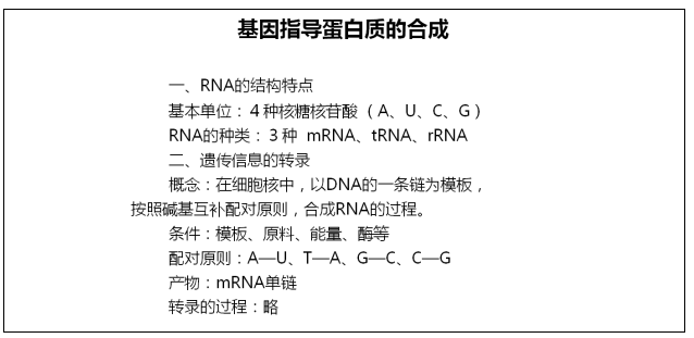 重點(diǎn):RNA的結(jié)構(gòu)特點(diǎn)和遺傳信息轉(zhuǎn)錄的過程;遺傳信息翻譯的過程。