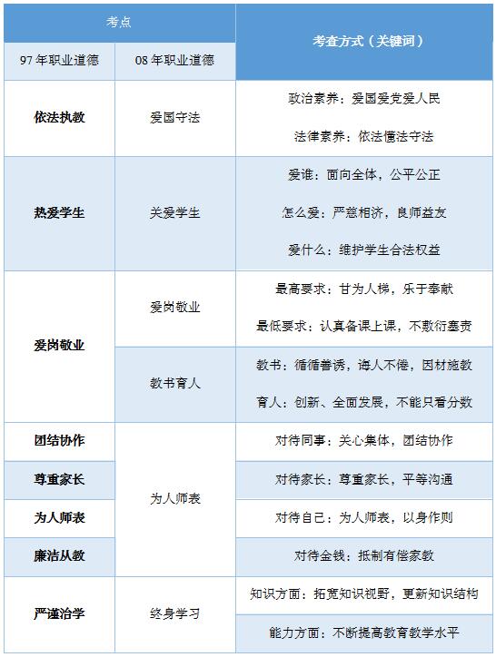 ①愛誰(對(duì)象)--關(guān)心愛護(hù)全體學(xué)生,②怎么愛(方式)--尊重學(xué)生人格,平等公正對(duì)待學(xué)生。對(duì)學(xué)生嚴(yán)慈相濟(jì),做學(xué)生良師益友。③愛什么(內(nèi)容)--保護(hù)學(xué)生安全(08新增),關(guān)心學(xué)生健康,維護(hù)學(xué)生權(quán)益。④最低要求--不諷刺、挖苦、歧視學(xué)生,不體罰或變相體罰學(xué)生。