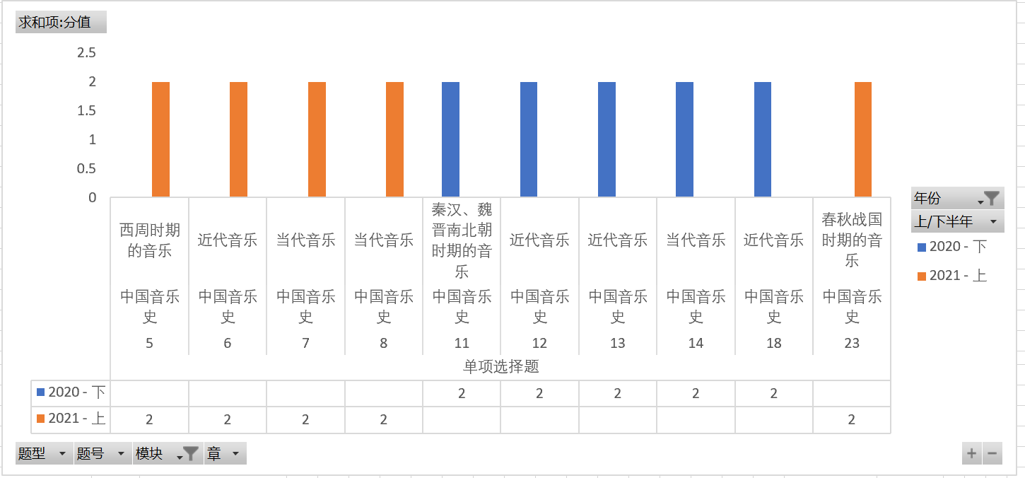 近三年(2021下半年、2022上半年部分題目缺失),中國(guó)音樂史這一模塊,從題量分值上看,題量上保持在5題,分值在10分左右。從考查形式上看,考查題型均為單項(xiàng)選擇題。從考查內(nèi)容上看,主要圍繞西周、春秋、戰(zhàn)國(guó)時(shí)期,20世紀(jì)30年代重要代表人物以及當(dāng)代音樂著名作曲家及代表作品等。各年考查知識(shí)點(diǎn)比較分散,考查內(nèi)容變化不大,考查難度不大,備考難度較大。由此可見,中國(guó)音樂史在資格證考查中的出題方式非常穩(wěn)定。