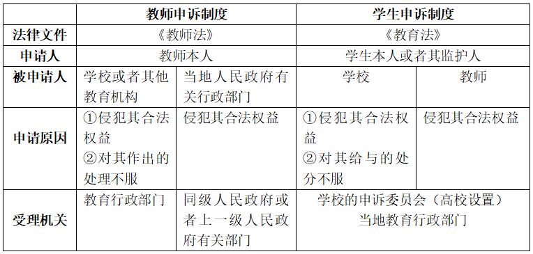 在教師招聘的歷年考試中,關(guān)于教師申訴制度和學(xué)生申訴制度是一個??贾R點,考查形式可能是單選題,判斷題,也可能會出現(xiàn)在案例分析題的選項里,考生們往往由于未進(jìn)行系統(tǒng)的梳理總結(jié),總是容易把這兩者進(jìn)行混淆,以至于在解答題目的過程中可能會出現(xiàn)失分的現(xiàn)象。鑒于此種情況,本文在此對教師招聘考試中的教師申訴和學(xué)生申訴進(jìn)行系統(tǒng)的總結(jié)梳理,希望對各位考生的備考有所幫助。