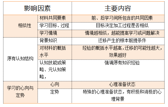 影響遷移的主要因素:相似性、原有認知結構、學習的心向與定勢。