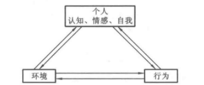 第三種交互作用模式也是我們常常見到的。個體、環(huán)境與行為三者相互影響的三元交互作用觀。如圖1-2所示。