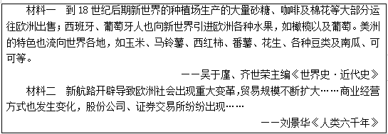 學(xué)生分析史料,回答問題:原因是新航路開辟與西方殖民擴(kuò)張。具體表現(xiàn)有國際流通中的商品種類與數(shù)量大大增加;貿(mào)易的擴(kuò)大促進(jìn)了股份公司的出現(xiàn)和發(fā)展。