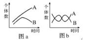 (數(shù)量上呈現(xiàn)出“你死我活”的“同步性變化”,兩種生物的生存能力不同,如圖a;兩種生物的生存能力相同,如圖b。)