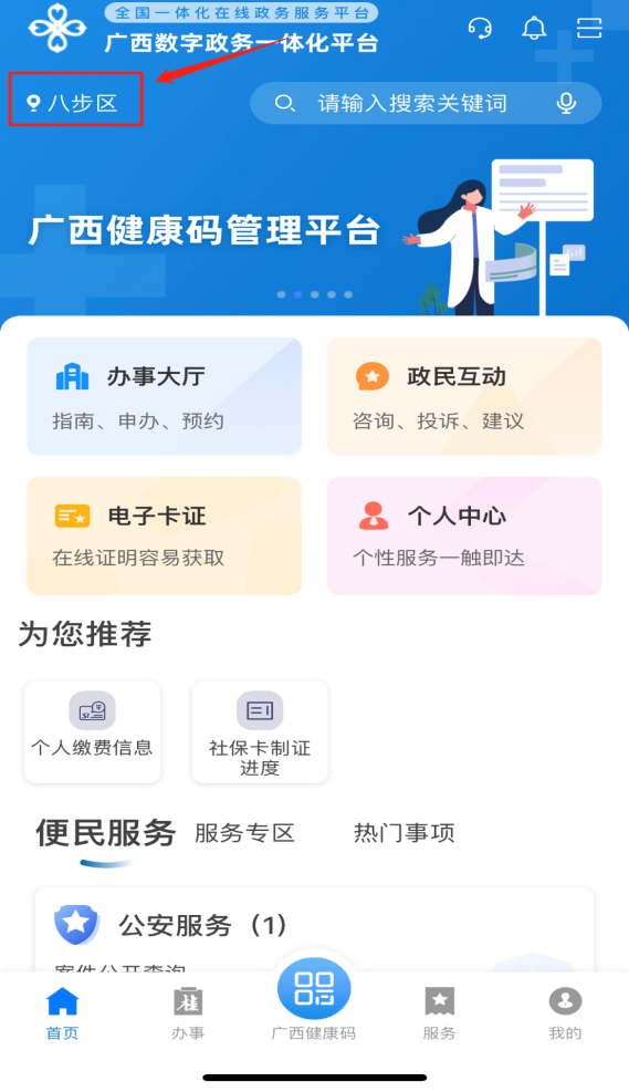 在市民手機(jī)上打開(kāi)“廣西政務(wù)”APP,選擇“八步區(qū)”。