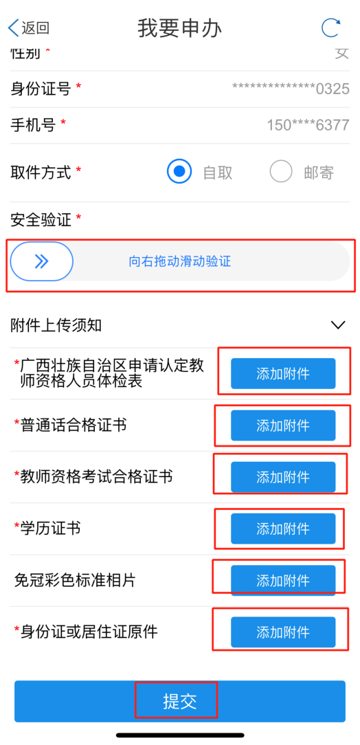 按提示逐項(xiàng)提交附件照片,可以現(xiàn)場(chǎng)“拍照”上傳附件審批材料,注意向右拖動(dòng)滑動(dòng)驗(yàn)證才能上傳照片,最后點(diǎn)擊下方“提交”按鈕即可完成全流程網(wǎng)辦操作。