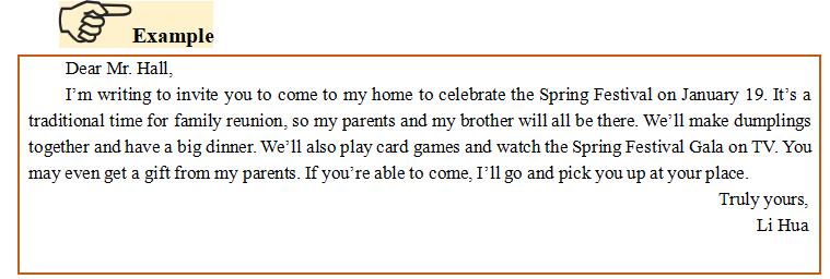 假定你是李華,得知外教Mr. Hall寒假不回國(guó),想邀請(qǐng)他到你家過(guò)春節(jié)。請(qǐng)給他寫一封信,內(nèi)容包括: