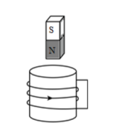 【解析】由題目中圖可知,當磁鐵豎直向上運動時,穿過線圈的磁場方向向下減小,由楞次定律可知感應電流的磁場方向應向下。由安培定則可知線圈中產(chǎn)生感應電流的方向與圖中箭頭方向相反;由"來拒去留"可知,磁鐵遠離線圈時,磁鐵與線圈相互吸引,故ABC錯誤,D正確。
