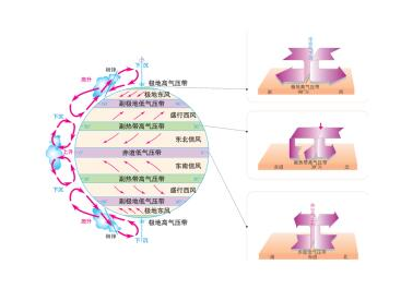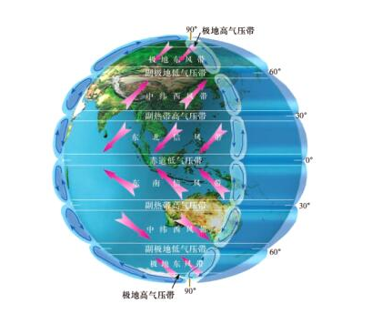 全球共形成七個(gè)氣壓帶,即赤道低氣壓帶,南北半球的副熱帶高氣壓帶,南北半球的副極地低氣壓帶,南北半球的極地高氣壓帶。在氣壓帶之間形成了六個(gè)風(fēng)帶,即南北半球低緯的信風(fēng)帶,南北半球中緯的西風(fēng)帶,南北半球的極地東風(fēng)帶。
