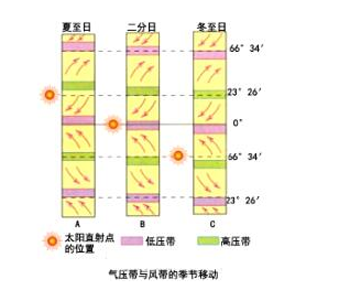 由于太陽(yáng)直射點(diǎn)隨季節(jié)變化而南北移動(dòng),氣壓帶和風(fēng)帶在一年內(nèi)也作周期性季節(jié)移動(dòng)。在北半球,與二分日相比,氣壓帶和風(fēng)帶的位置大致夏季偏北,冬季偏南,南半球反之。