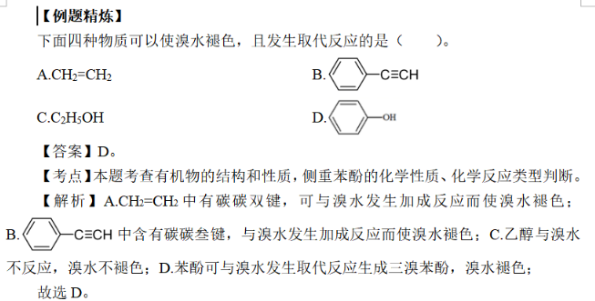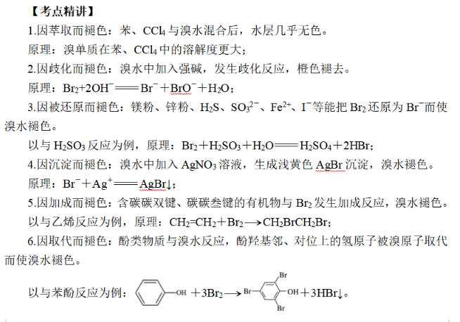 考察的題型,有選擇題和填空題兩種形式。填空題往往會(huì)結(jié)合有機(jī)物官能團(tuán)性質(zhì),考察褪色原理;或者結(jié)合實(shí)驗(yàn)操作,對實(shí)驗(yàn)現(xiàn)象、結(jié)論分析。填空題則更多利用化學(xué)方程式解釋溴水褪色的原理。下面,我們對溴水褪色的六種情況進(jìn)行歸納總結(jié),希望幫助大家進(jìn)行理解和記憶。