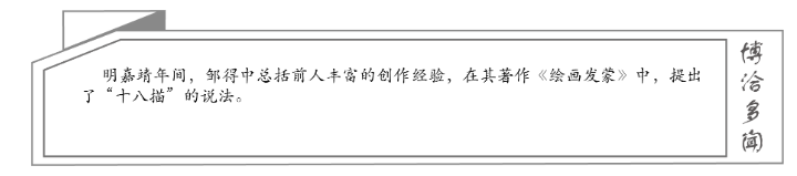 白描畫法是人類最早,最簡潔的繪畫表現(xiàn)形式,我國古代稱為“線描”。它是運用線條的濃淡,粗細(xì)、方圓、轉(zhuǎn)折變化和用筆的輕重、快慢、提按、頓挫等藝術(shù)手法,來描繪物體的結(jié)構(gòu)、質(zhì)量感、空間感,并采用聚散、疏密、虛實、強(qiáng)弱等線描形式因素獲得形神,從而傳達(dá)作者感受的一種藝術(shù)形式。如唐朝吳道子、北宋畫家李公麟可稱是白描畫法得代表性人物。到了明嘉慶年間,鄒得中總括前人豐富的創(chuàng)作經(jīng)驗,提出“十八描”(古代人物衣服褶紋的各種描法,并按照筆跡形狀命名)法即:行云流水描、高古游絲描、鐵絲描、柳葉描、琴弦描、螞蝗描、混描、橛頭釘描、曹衣描、釘頭鼠尾描、折蘆描、減筆描、戰(zhàn)筆水紋描、竹葉描、橄欖描、蚯蚓描、棗核苗、枯柴描。