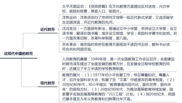 (2)近代的教育:本內(nèi)容主要涉及洋務(wù)運(yùn)動(dòng)、戊戌變法等關(guān)于教育改革的措施,題型以選擇題為主。