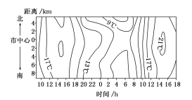 自某城市市中心向南、向北分別設(shè)若干站點,監(jiān)測城市氣溫的時空分布。監(jiān)測時間為8日(多云)9時到9日(晴)18時。監(jiān)測結(jié)果如下圖所示。據(jù)此完成1~2題。