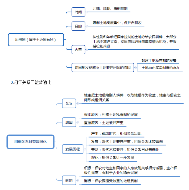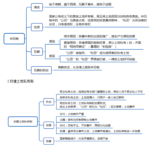 中國(guó)古代的土地制度是經(jīng)濟(jì)史專題中的重要考點(diǎn),同時(shí)也是教師招聘考試中的考試分析。在考試過(guò)程中既會(huì)出現(xiàn)材料型的單選題,也會(huì)有相關(guān)的材料分析題,重在考查大家的理解和分析能力。這部分內(nèi)容主要涉及井田制、封建土地私有制、均田制等內(nèi)容,我們?cè)趶?fù)習(xí)過(guò)程中不僅要掌握各個(gè)土地制度的性質(zhì)、發(fā)展演變及其瓦解的相關(guān)內(nèi)容,而且要理解土地制度對(duì)農(nóng)民的人身依附有著怎樣的關(guān)系,將知識(shí)的前因后果梳理清楚,這樣才能以不變應(yīng)萬(wàn)變。接下來(lái)我們將以思維導(dǎo)圖的形式為大家一一梳理,以方便大家備考。