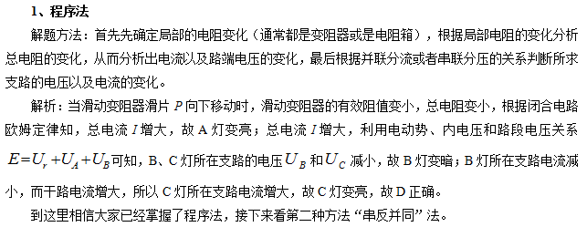 根據(jù)歷年的考題可以總結(jié),這類題型基本都根據(jù)一個(gè)局部電路電阻的變化情況,判斷這個(gè)電阻所在的支路、其他支路以及干路上的電流、電壓、電功率的變化情況。對于這種問題的解決方法常用的有兩種: