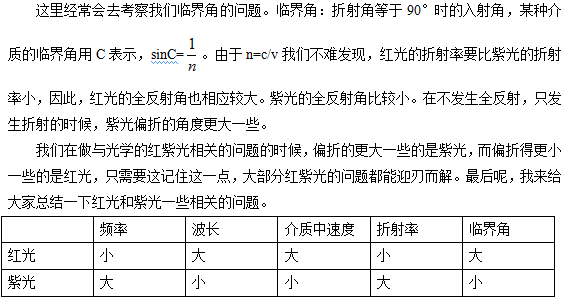 那么我們知道在光譜圖中,紫光與紫外線相鄰,而紅光與紅外線相鄰。因而紫光比紅光的能量大頻率也更高。根據(jù)光學(xué)的知識(shí)我們能知道,各種顏色的光在真空中傳播的速度都是相同的即:c=3×108m/s因此我們不難得知紫光的波長是要比紅光短的。并且紅光和紫光有這樣的性質(zhì),再除了真空以外的其他介質(zhì)中傳播的時(shí)候,紅光傳播的要比紫光傳播的快。對于這一點(diǎn)呢,經(jīng)常會(huì)在全反射的這個(gè)地方去考察大家關(guān)于臨界角的問題,或者是考察大家關(guān)于折射的問題。這里我就來先介紹一下關(guān)于全反射現(xiàn)象。