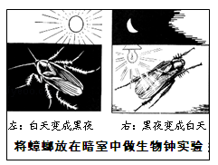 在標(biāo)本瓶?jī)?nèi)裝幾只蟑螂以及它們吃的食物,瓶口用白紗布封住,使瓶?jī)?nèi)透氣.白天用黑紙袋套在瓶外,使瓶?jī)?nèi)成為暗室;晚上揭開(kāi)黑紙袋,用燈照明,使瓶?jī)?nèi)成為白天.經(jīng)過(guò)一星期左右,蟑螂調(diào)整了自己的節(jié)律,在人工的“黑夜”活動(dòng)了。