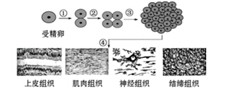 解答:如圖可知,細(xì)胞是人體結(jié)構(gòu)和功能的基本單位,人是由一個(gè)受精卵發(fā)育來的,受精卵分裂形成很多細(xì)胞B,使細(xì)胞數(shù)目增多.這些細(xì)胞一部分具有分裂能力繼續(xù)分裂,而另一部分細(xì)胞失去了分裂能力,停止分裂,開始分化,在此過程中,細(xì)胞的形態(tài)、結(jié)構(gòu)和功能產(chǎn)生了差異,形成了不同的組織.人體的組織主要有上皮組織、結(jié)締組織、神經(jīng)組織、肌肉組織.因此,圖中①②③表示細(xì)胞分裂的過程;④表示細(xì)胞分化的過程;人的大腦皮層主要由上圖中的神經(jīng)組織構(gòu)成,人體內(nèi)的血液屬于圖中的結(jié)締組織;細(xì)胞分化指在個(gè)體發(fā)育中,細(xì)胞后代在形態(tài)結(jié)構(gòu)和功能上發(fā)生穩(wěn)定性的差異的過程.兩個(gè)過程細(xì)胞核中的遺傳物質(zhì)不改變.