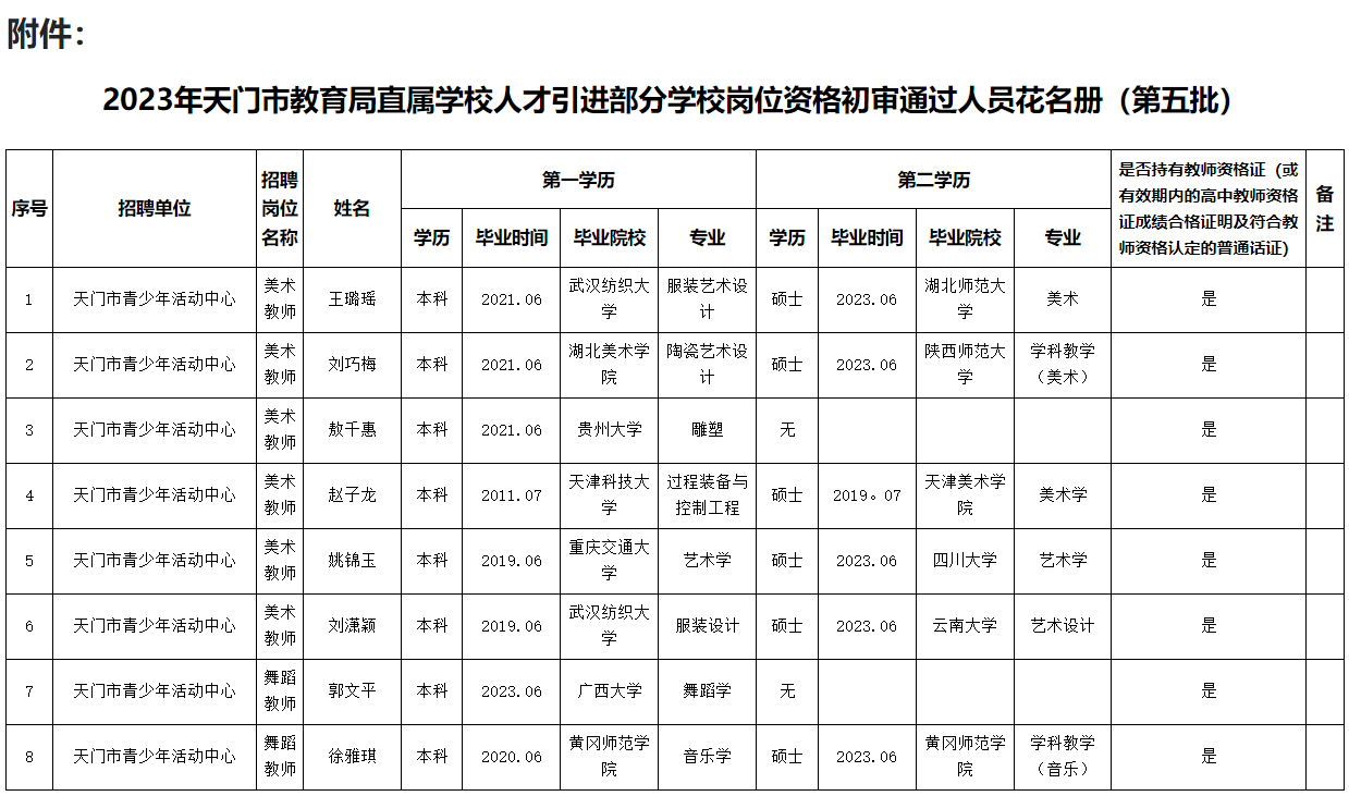 附件:2023年天門市教育局直屬學校人才引進部分學校崗位資格初審通過人員花名冊(第五批)