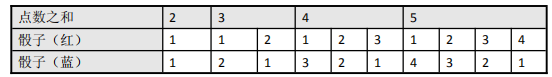 2.如果點(diǎn)數(shù)之和是 3,紅色骰子上是 1,藍(lán)色骰子上是多少?;如果紅色骰子上是 2,藍(lán)色骰子上是多少?還有其點(diǎn)數(shù)之和是 3 的情況嗎?一共有幾種情況?