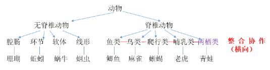 整合協(xié)作原則可以理解為下位學(xué)習(xí)的相關(guān)類屬,新學(xué)習(xí)的內(nèi)容可以擴(kuò)展修飾原有舊知識(shí),使舊知識(shí)的量得到擴(kuò)充和精確化,如下面的橫向結(jié)構(gòu)圖,學(xué)生已經(jīng)學(xué)習(xí)了鳥類、魚類、爬行類、哺乳類的脊椎動(dòng)物后,老師又新介紹了“兩棲類”的動(dòng)物,使原有的脊椎動(dòng)物內(nèi)容得到擴(kuò)充,這就是相關(guān)類屬。