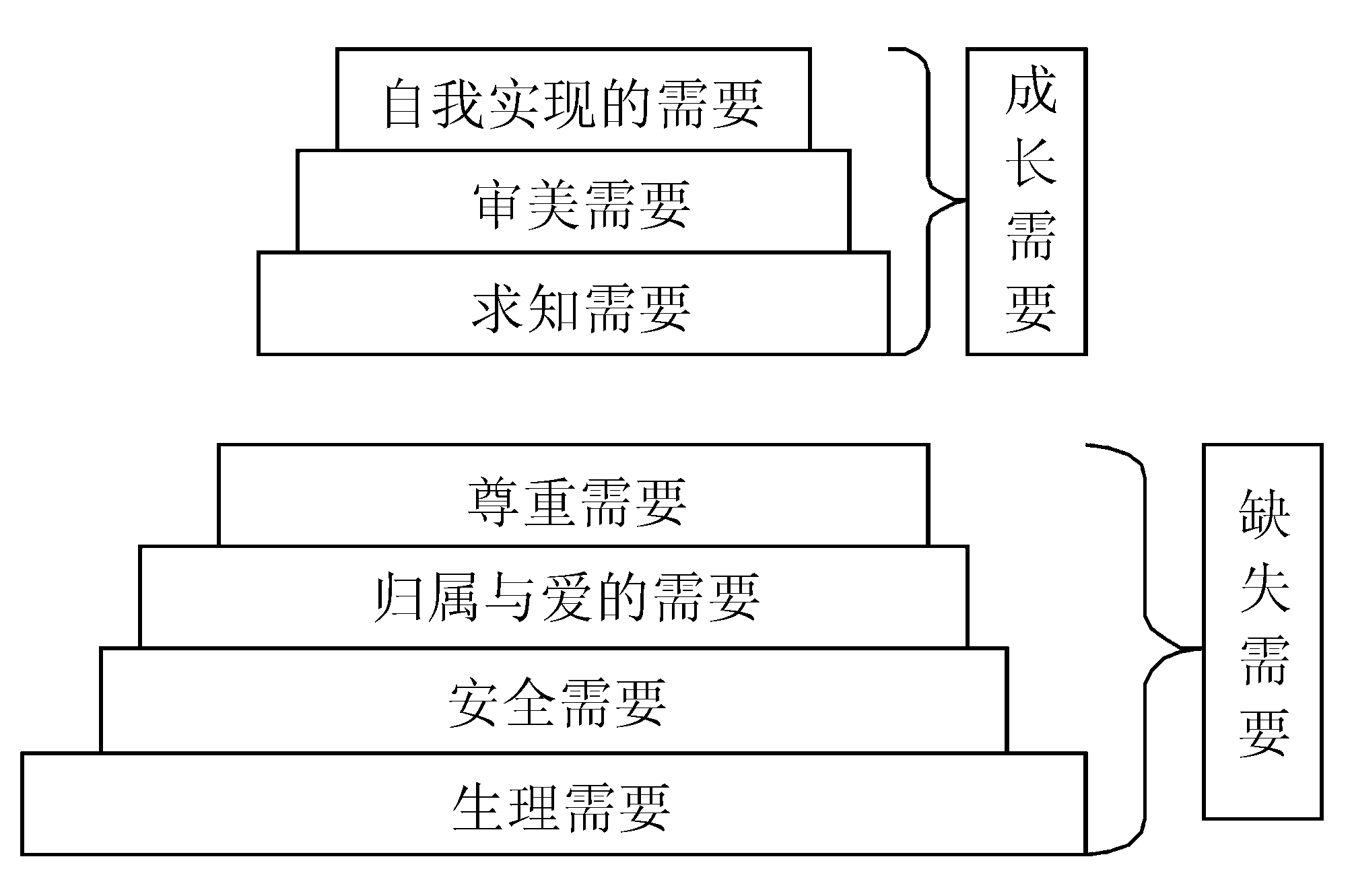 馬斯洛對(duì)以上七種需要進(jìn)行了進(jìn)一步的區(qū)分:位于需要層次底部的四種需要被稱(chēng)為缺失需要,它們是個(gè)體生存所必需的,必須得到一定程度的滿足。但是,這些需要一旦滿足,由此產(chǎn)生的動(dòng)機(jī)就會(huì)趨于消失。后三種需要是成長(zhǎng)需要,它們雖不是我們生存所必需的,但對(duì)于我們適應(yīng)社會(huì)來(lái)說(shuō)卻有重要的積極意義。也就是說(shuō),缺失需要使我們得以生存,成長(zhǎng)需要使我們能夠更好地生活。較低級(jí)的需要至少必須部分滿足之后才會(huì)出現(xiàn)對(duì)較高級(jí)需要的追求。最占優(yōu)勢(shì)的需要將支配一個(gè)人的意識(shí)和行為,高級(jí)需要出現(xiàn)之后,低級(jí)需要仍然存在,但對(duì)行為的影響減弱了。例如,在一個(gè)非常饑餓的孩子面前同時(shí)擺上一堆書(shū)和一堆食物,讓其選擇其一,孩子肯定先選食物,吃飽以后再去選書(shū)讀。與缺失需要相反,成長(zhǎng)需要是永遠(yuǎn)得不到完全滿足的需要,因?yàn)闊o(wú)論是求知,還是審美,都是永無(wú)止境的。