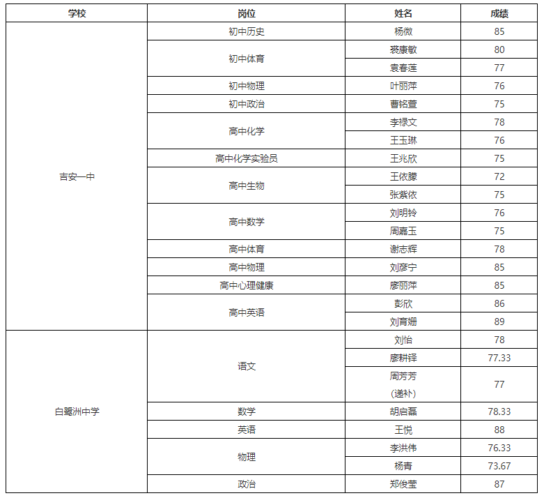 根據(jù)吉安市教育體育局吉安市人力資源和社會保障局《吉安一中、白鷺洲中學(xué)公開招聘教師公告》和《吉安一中*公開招聘教師補充公告》、《白鷺洲中學(xué)公開招聘教師補充公告》,在總成績達到70分及以上的考生中,按照考試總成績從高分到低分等額確定招聘崗位體檢對象,現(xiàn)將入闈體檢人員名單予以公告,具體名單見附件。體檢時間另行電話通知。