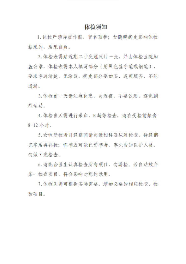 3.體檢當(dāng)天早晨空腹(不吃飯、不喝水,頭天盡量不要飲用飲料或食用大量水果、甜食),有關(guān)《體檢須知》附后。