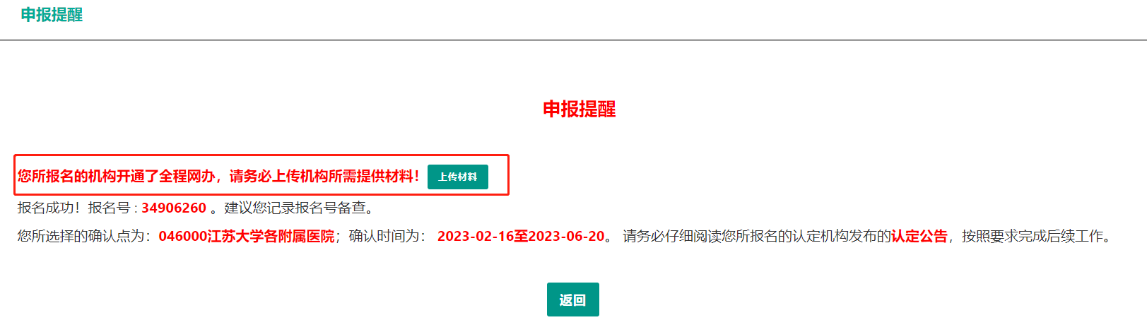 出現(xiàn)【上傳材料】按鈕,說(shuō)明您選擇的認(rèn)定機(jī)構(gòu)開(kāi)通了全程網(wǎng)辦,需要按照認(rèn)定機(jī)構(gòu)的工作要求上傳全程網(wǎng)辦相關(guān)材料。如對(duì)所需材料有疑問(wèn),可咨詢(xún)認(rèn)定機(jī)構(gòu)。