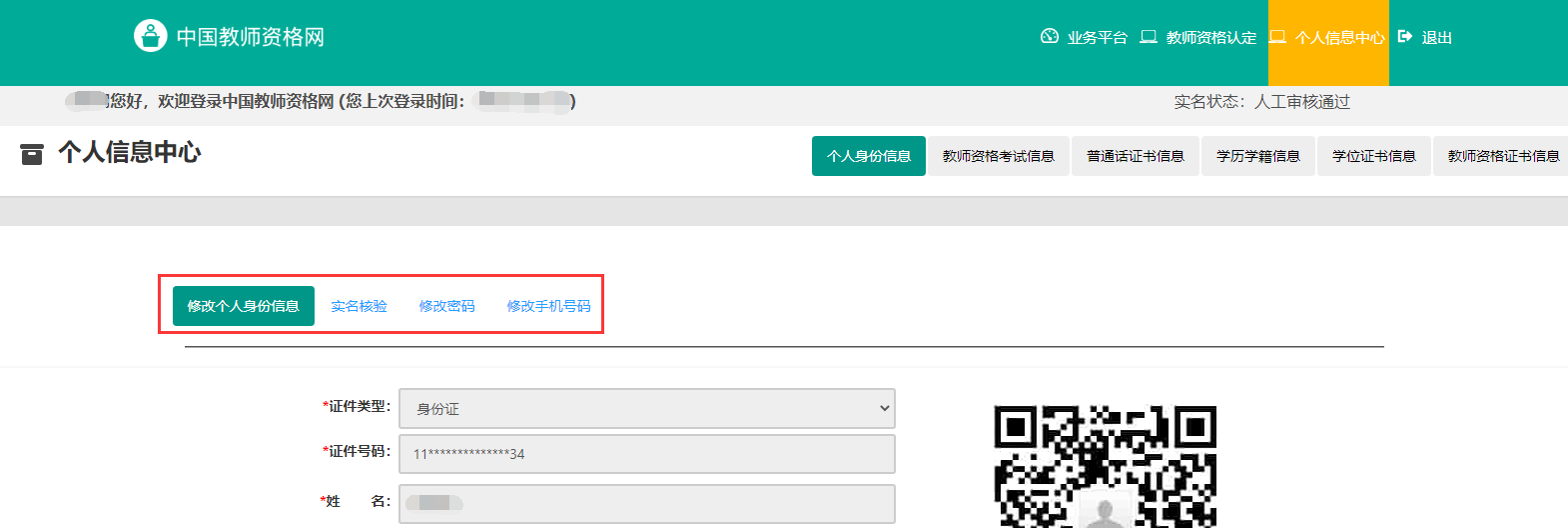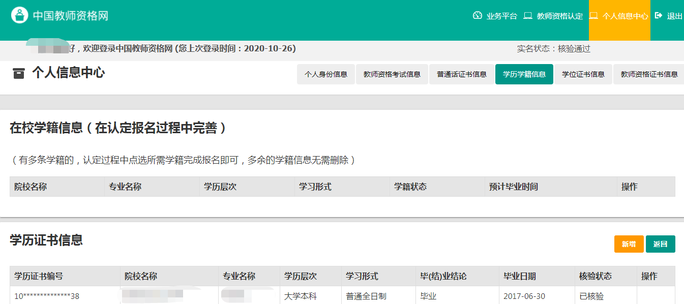 個(gè)人信息中心共有七個(gè)模塊:個(gè)人身份信息、教師資格考試信息、普通話證書(shū)信息、學(xué)歷學(xué)籍信息、學(xué)位證書(shū)信息、教師資格證書(shū)信息、其他證書(shū)信息。
