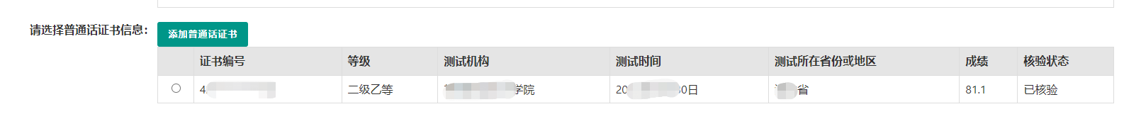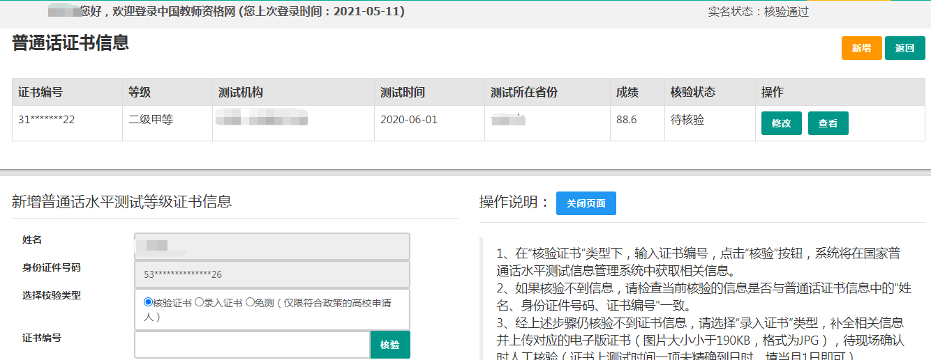 ②錄入證書(shū):僅限2007年之前的普通話證書(shū)或無(wú)法核驗(yàn)通過(guò)的證書(shū)。補(bǔ)全相關(guān)信息(普通話信息分?jǐn)?shù)欄必須填寫(xiě)數(shù)字)后,需攜帶證書(shū)原件至現(xiàn)場(chǎng)確認(rèn)時(shí)人工核驗(yàn)。核驗(yàn)狀態(tài)指系統(tǒng)核驗(yàn)狀態(tài),人工核驗(yàn)通過(guò)不會(huì)更改核驗(yàn)狀態(tài)。