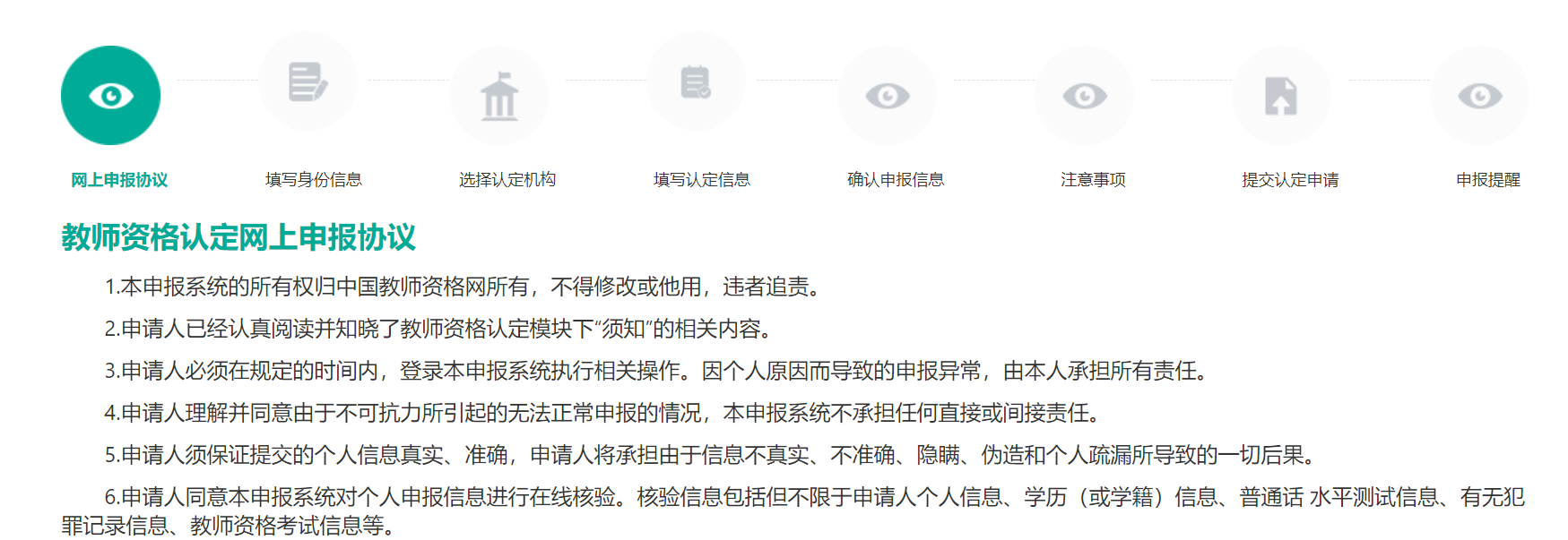 (三)申請(qǐng)人應(yīng)如實(shí)提交相關(guān)材料,并對(duì)所填報(bào)的個(gè)人信息提供的現(xiàn)場(chǎng)審核材料的準(zhǔn)確性、真實(shí)性負(fù)責(zé);故意弄虛作假,騙取教師資格的將依據(jù)國(guó)家有關(guān)規(guī)定進(jìn)行處理。