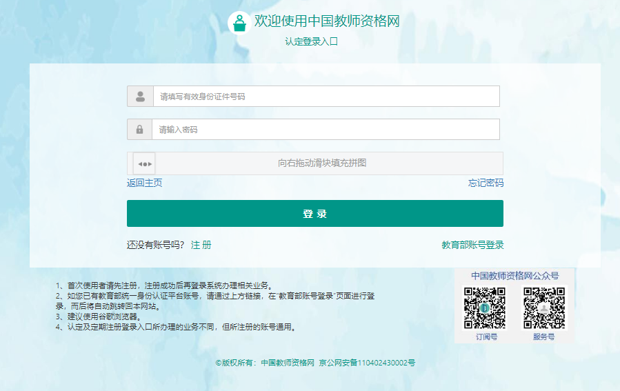 申請(qǐng)人登錄中國(guó)教師資格網(wǎng)(http://www.jszg.edu.cn),將看到中國(guó)教師資格網(wǎng)首頁(yè)如下圖。因各瀏覽器兼容適配問(wèn)題,建議您使用谷歌瀏覽器或360安全瀏覽器極速模式進(jìn)行后續(xù)操作。