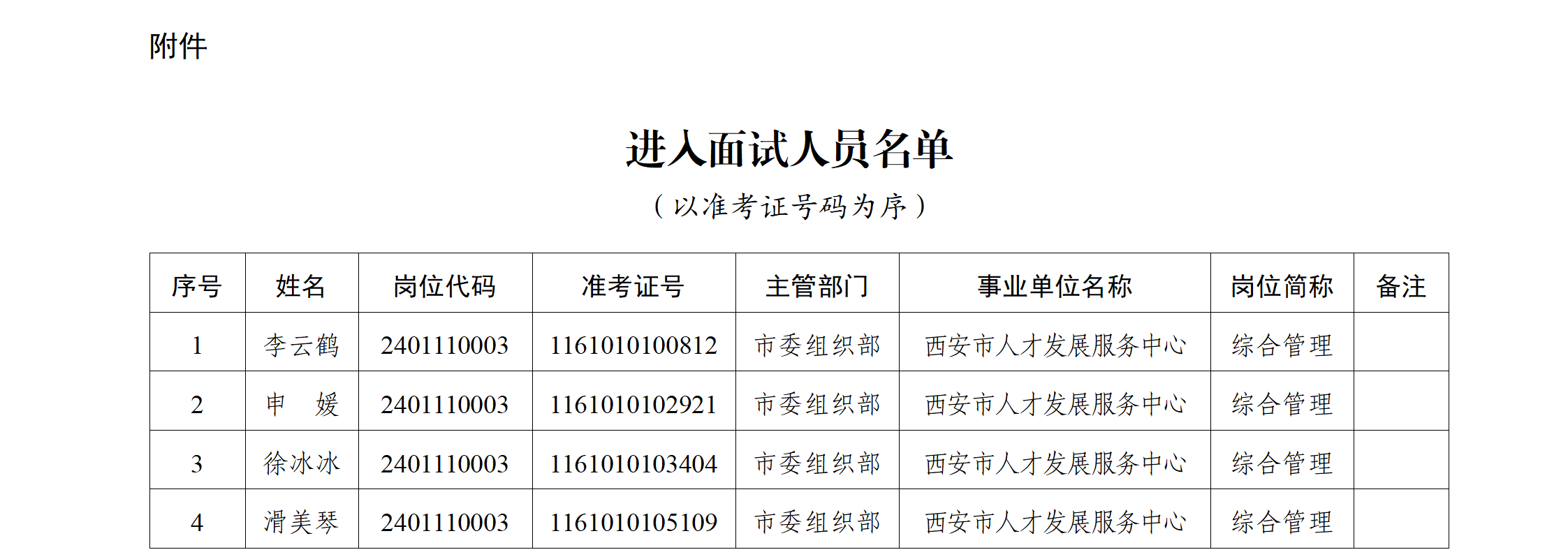根據(jù)中共西安市委組織部、西安市人力資源和社會保障局《2024年西安市事業(yè)單位公開招聘(募)工作人員的公告》要求,現(xiàn)將我部直屬事業(yè)單位西安市人才發(fā)展服務(wù)中心面試安排公告如下:
