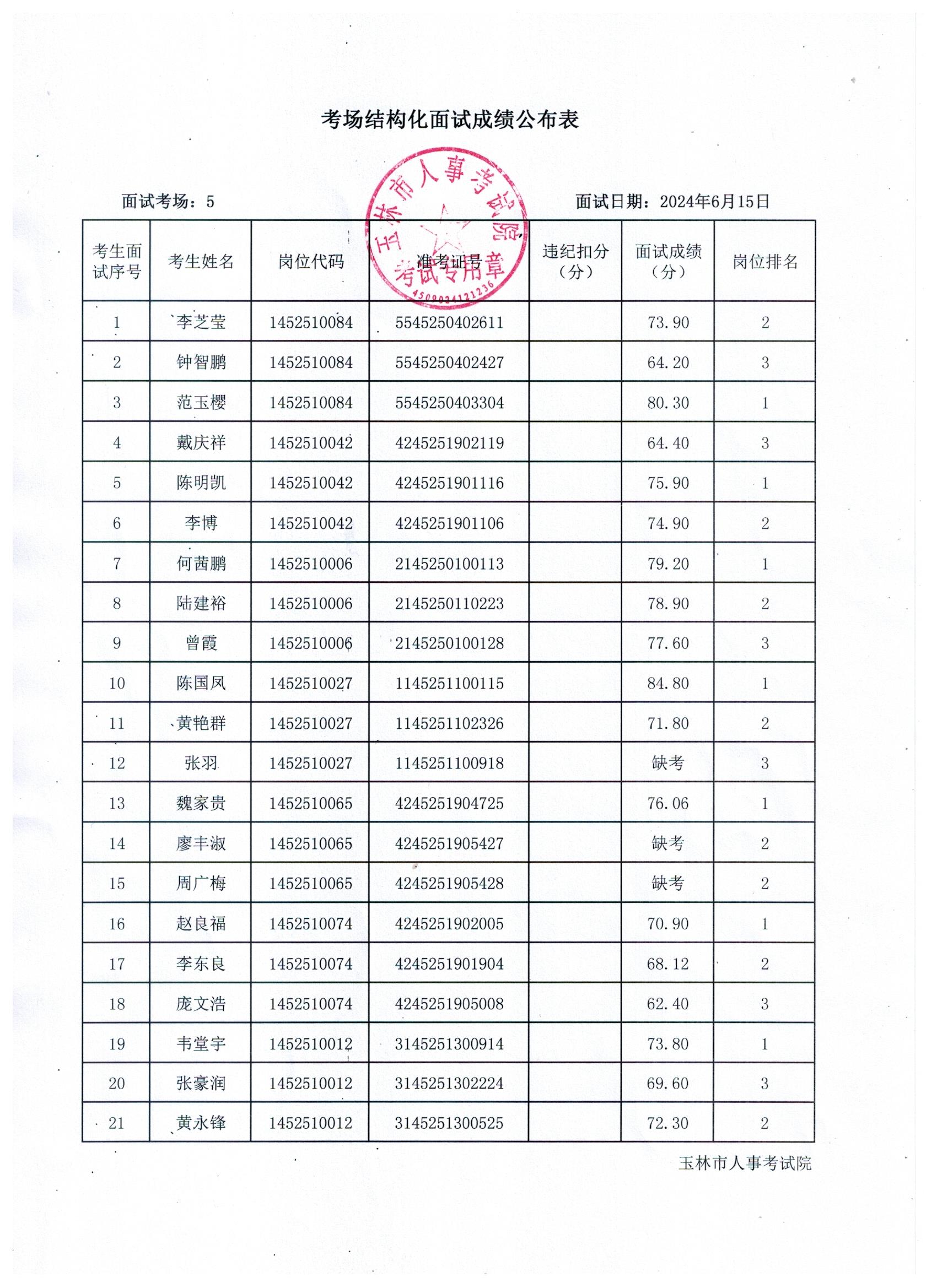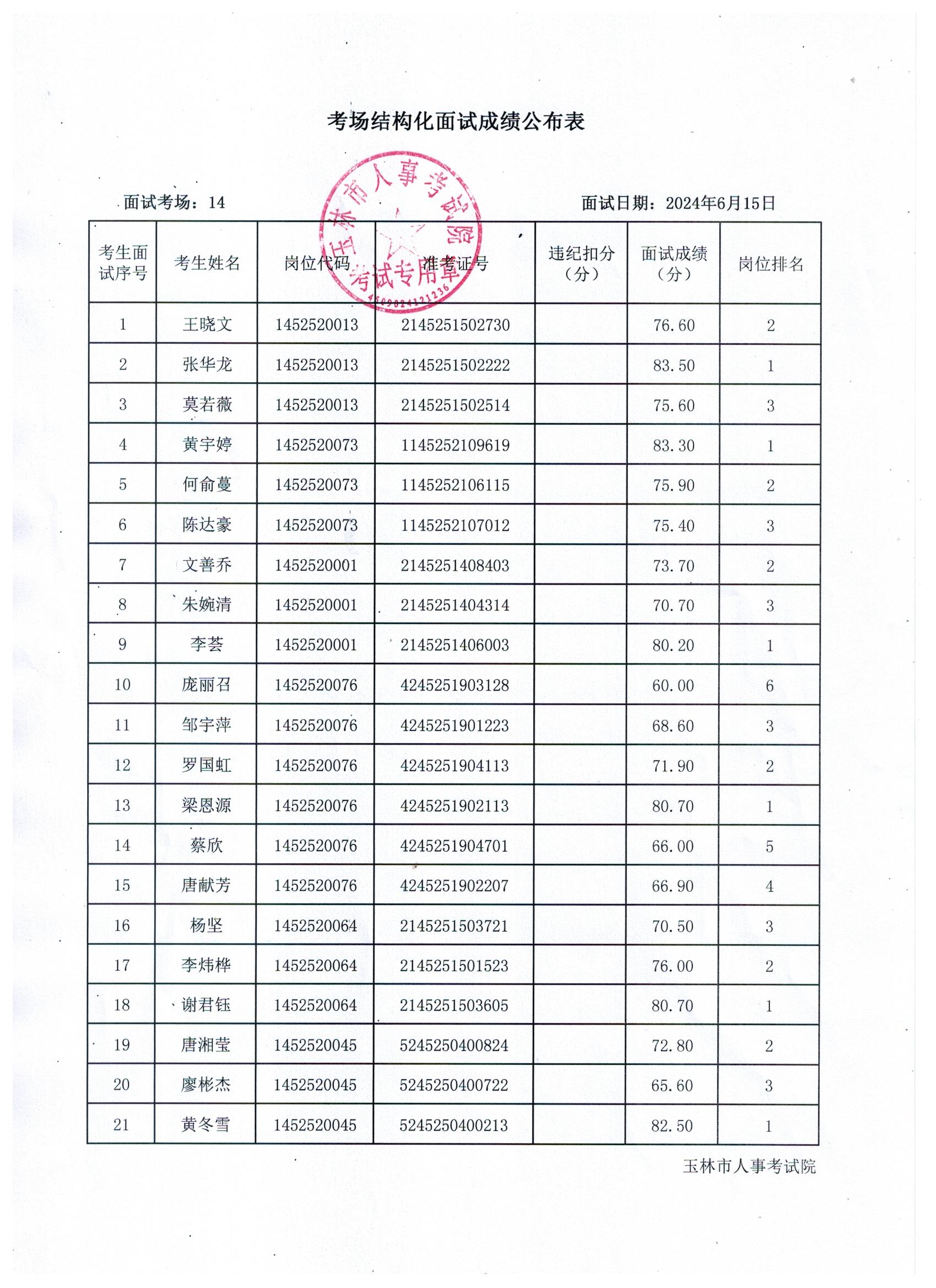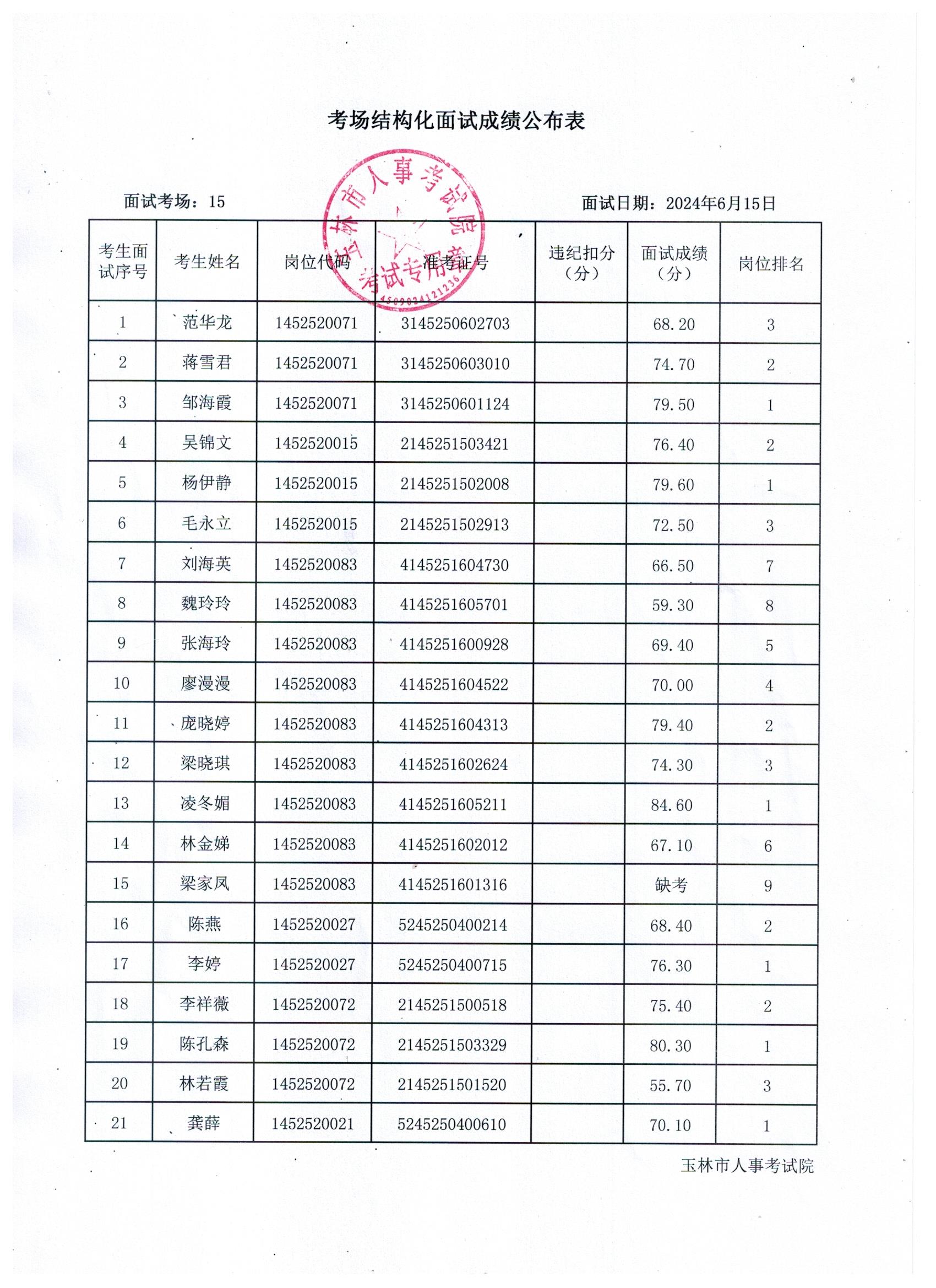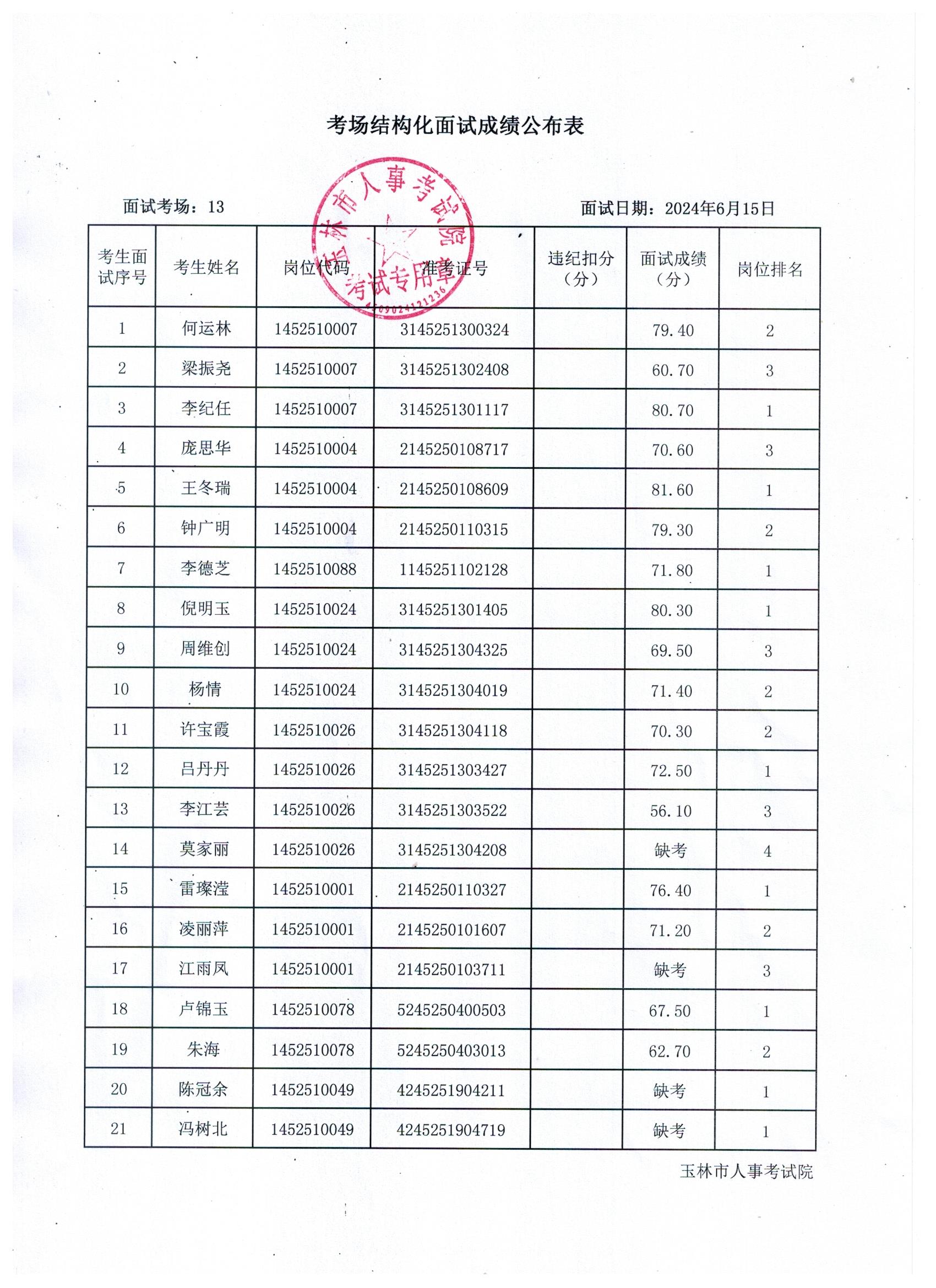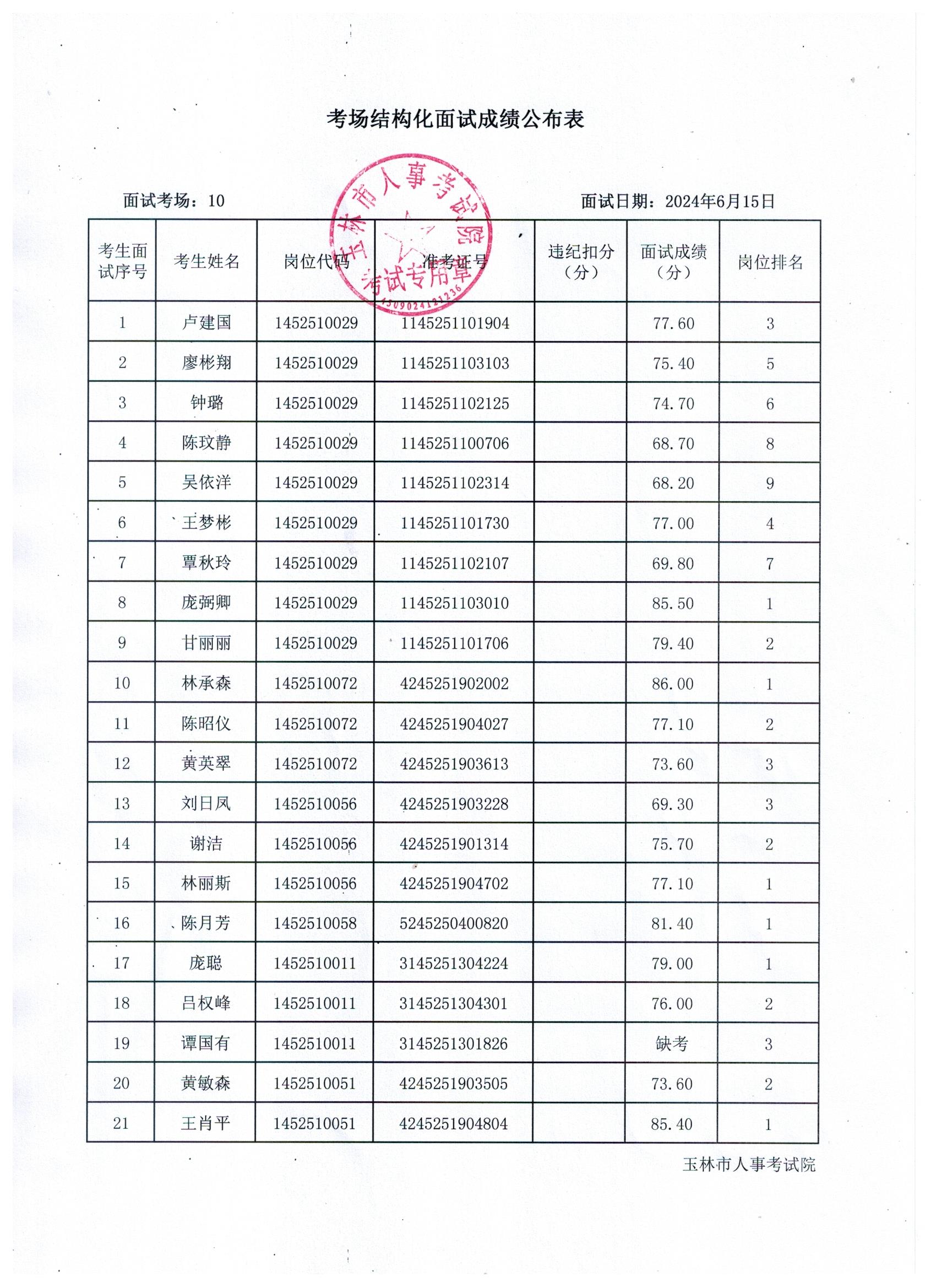 原文標(biāo)題:2024年玉林市直(含玉州區(qū)、福綿區(qū)、玉東新區(qū))事業(yè)單位公開招聘人員面試成績(jī)公布(6月15日)