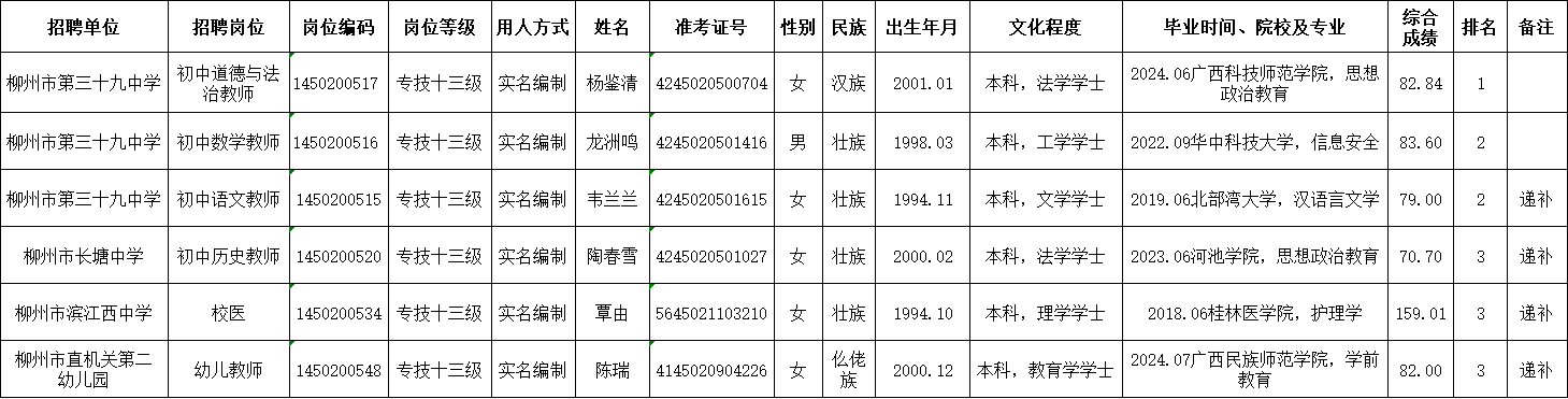 原文標(biāo)題:2024年度柳北區(qū)所屬事業(yè)單位公開考試招聘工作人員擬聘用人選公示(第六批)-擬聘用人選公示-廣西柳州市人力資源和社會保障局網(wǎng)站